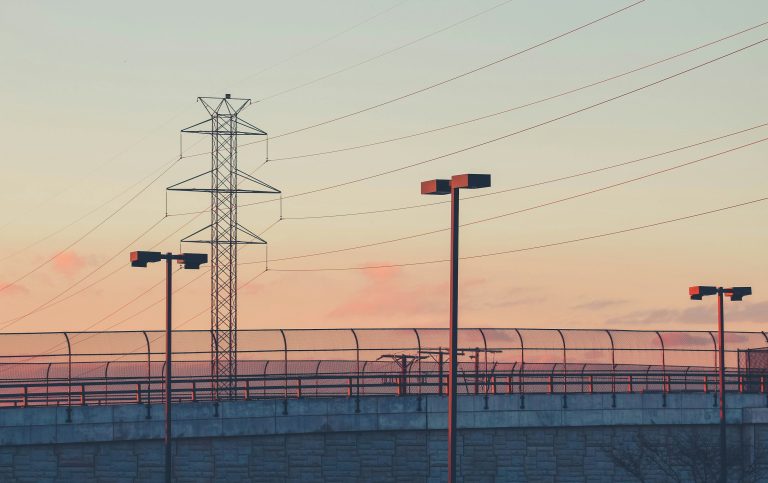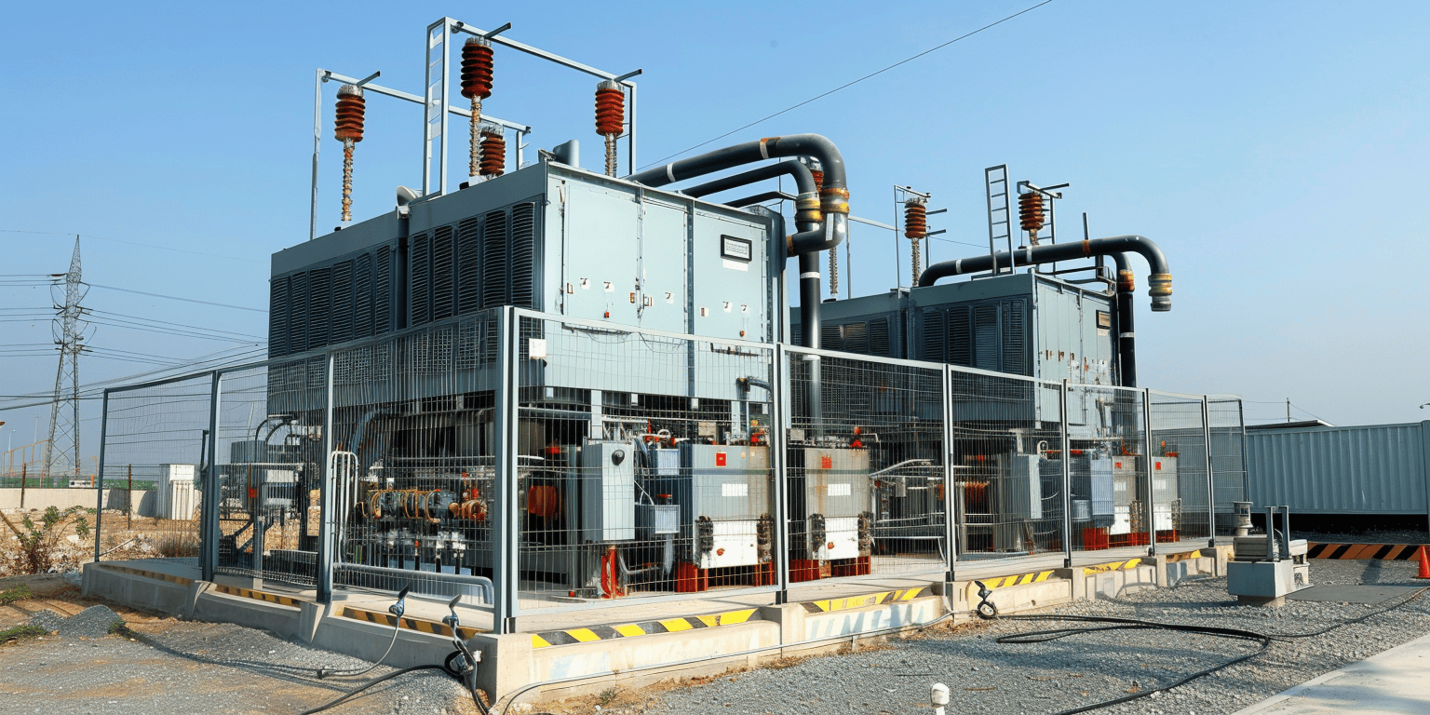 Product Gallery Construction worker fixing electricity equipment on a cherry picker A male electrician works in a switchboard with an electrical connecting cable, connects the equipment with tools. Electrical substation, Pylons and wires distribute power through high voltage trasmission lines. Blue Sky Queensland Australia.